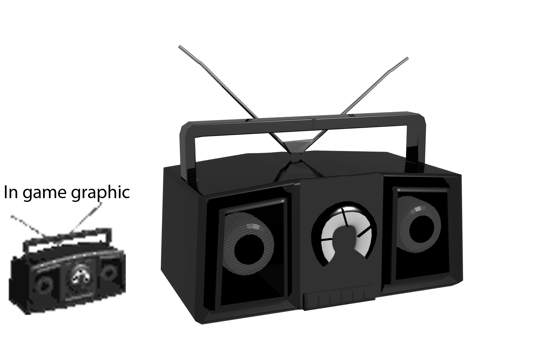 ^ Thank you for taking the time to reply. Those boom boxes have too many buttons and detail then the one in the game. I am trying to stay canon to the in game graphic. Get the overall likeness etc.