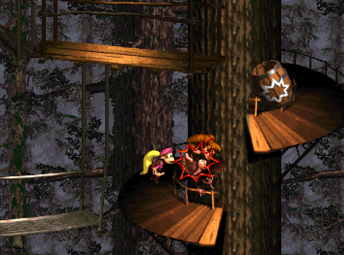 I'm working on a vertical level like Treetop Town. It can't *just* be treetops, though, without tons of blasting barrels... so, rather than having tons of barrels, I'm combining the treetops with the walkways. I'm still not sure how to make the background, though, since Treetop Town background trees don't go up that far. I may have to make something special, but we'll see. I'll throw in a preview after I've finished with the level basics. :swanky: